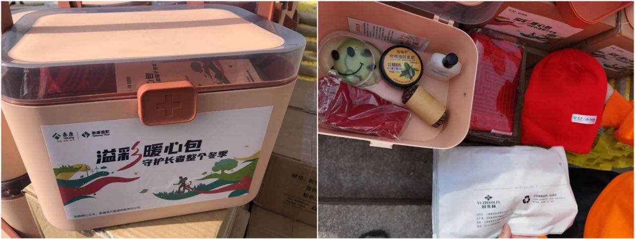 “溢彩暖心包”包含关节痛发热护膝、保暖手套、老年袜、围巾、暖宝宝贴、暖手宝、护肤甘油、橄榄油尿素霜、护手霜等三类九种过冬物品,从头到脚抵御寒冷,细致呵护爷爷奶奶们的冬日生活。