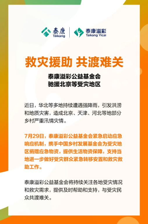 2023年8月,基金会支援价值近百万元物资用于京冀防汛救灾,联动泰康生态企业捐赠折叠床、棉被毛毯、消毒物品,衣物、生活用品等急需物资3万余件。